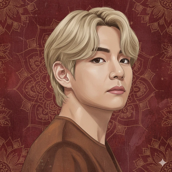 Vertical artistic portrait using the uploaded image as a hard identity lock. Preserve exact face: same facial structure, skin tone, eye shape, eyebrows, nose, lips, hairline, hair texture,beard/stubble if present. No beautification. No face change. Vertical frame 9:16. Medium close-up close-up. Subject turned slightly sideways, head gently rotated back toward the camera, over-the-shoulder feel. Eyes looking directly at the viewer with a calm, composed gaze. Expression neutral to soft. Natural masculine posture. Foreground subject sharply defined. Skin rendered in a painterly illustrated style, not photorealistic. Visible brush strokes, fine linework, soft texture. Maintain realistic facial planes adapted to a male face. Hair unchanged from the uploaded image, softly textured, natural fall. Clothing simple and traditional-toned, blending with the artwork (no modern logos). Background: deep maroon and crimson red, textile-inspired surface with intricate hand-drawn mandala and lotus motifs, Indian miniature / folk mural style. Aged parchment texture,