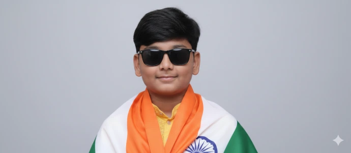 A high-resolution studio portrait of a young Indian boy use my photo sunglasses, looking directly at the camera with a calm, confident smile. He has short, styled dark brown hair with volume on top, a neatly trimmed beard and moustache, and a well-groomed appearance. He in the Indian national flag, draped over his shoulders like a shawl, with the saffron color at the top, white in the center with the Ashoka Chakra clearly visible, and green at. .