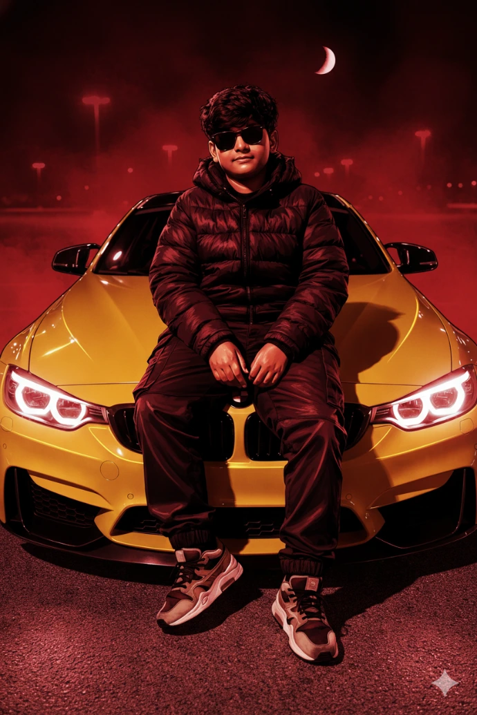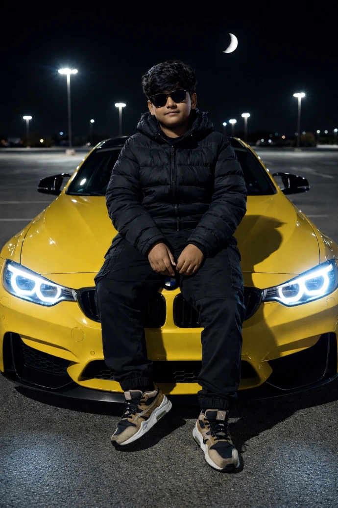 A young boy sits casually on the hood of a bright yellow BMW sports car in an empty parking lot at night. The camera angle is straight-on and eye-level, capturing his full body. He is wearing a black puffer jacket, black cargo pants, and stylish sneakers in beige, brown, and black. His hairstyle is thick, wavy, and slightly messy. His face is fully visible without sunglasses, showing a confident, relaxed expression. The parking lot is illuminated by tall streetlights, creating soft reflections on the glossy car surface. In the sky above, a bright crescent moon is visible, adding depth to the night atmosphere. The car headlights are turned on, casting a cool blue glow on the ground. The overall mood is cinematic, crisp, and modern, with clean lighting and high-detail realism. Ultra HD, sharp textures, natural shadows, realistic skin tone, professional night photography.