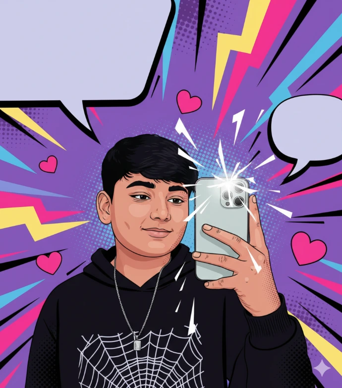 Transform the image into a high-end professional pop-art vector illustration. Use Clean vector shapes with accurate facial features, soft cartoon detailing, minimal halftone shading. Add comic bursts, dotted patterns, motion lines, energy effects, spark highlights using the photo's dominant colors. Bold outlines, crisp edges, vibrant balanced colors, fully color-adaptive pop-art background and some cute pink hearts!"