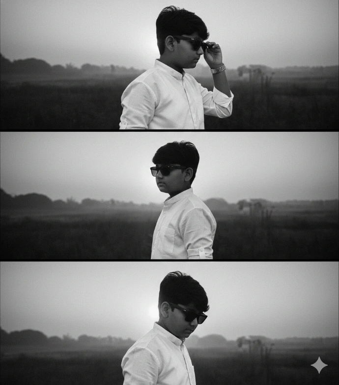 Apply this prompt to my uploaded image Dreamlike cinematic portrait of A young boy with tousled black hair, wearing a knitted white oversized shirt made of soft textured fabric. A single Silver thin necklace enhances his style. His sunglasses create a cool aura as he lowers his head gently. Sunlight in warm amber tones brushes his face and shoulder, glowing against a neutral cream wall: plz, face dont change."same face